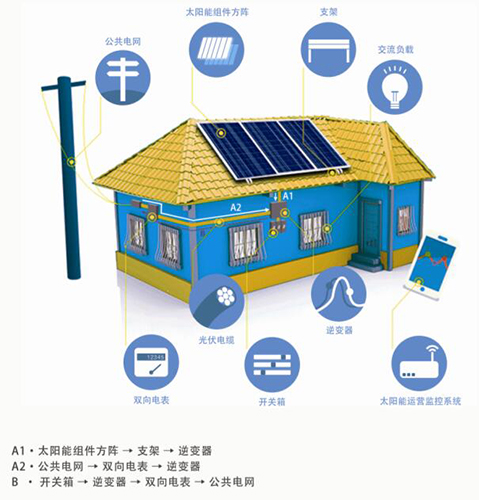 分布式光伏發(fā)電系統(tǒng),一般是建在工業(yè)廠房、商業(yè)建筑、農(nóng)業(yè)設(shè)施、市政公共建筑、民用建筑等滿足荷載要求的混凝土、彩鋼板和瓦片式屋頂以及邊遠(yuǎn)農(nóng)牧區(qū)、海島等少電無電地區(qū)。該類項目可以接入公共電網(wǎng),與公共電網(wǎng)一起為附近的用戶供電。分布式光伏發(fā)電遵循因地制宜、清潔高效、分散布局、就近利用的原則,充分利用當(dāng)?shù)靥柲苜Y源,替代和減少化石能源消費。 戶用分布式光伏系統(tǒng)主要由光伏組件、支架、逆變器及監(jiān)控系統(tǒng)等組成,安裝在居民區(qū)屋頂,發(fā)電量自發(fā)自用、余電上網(wǎng)。