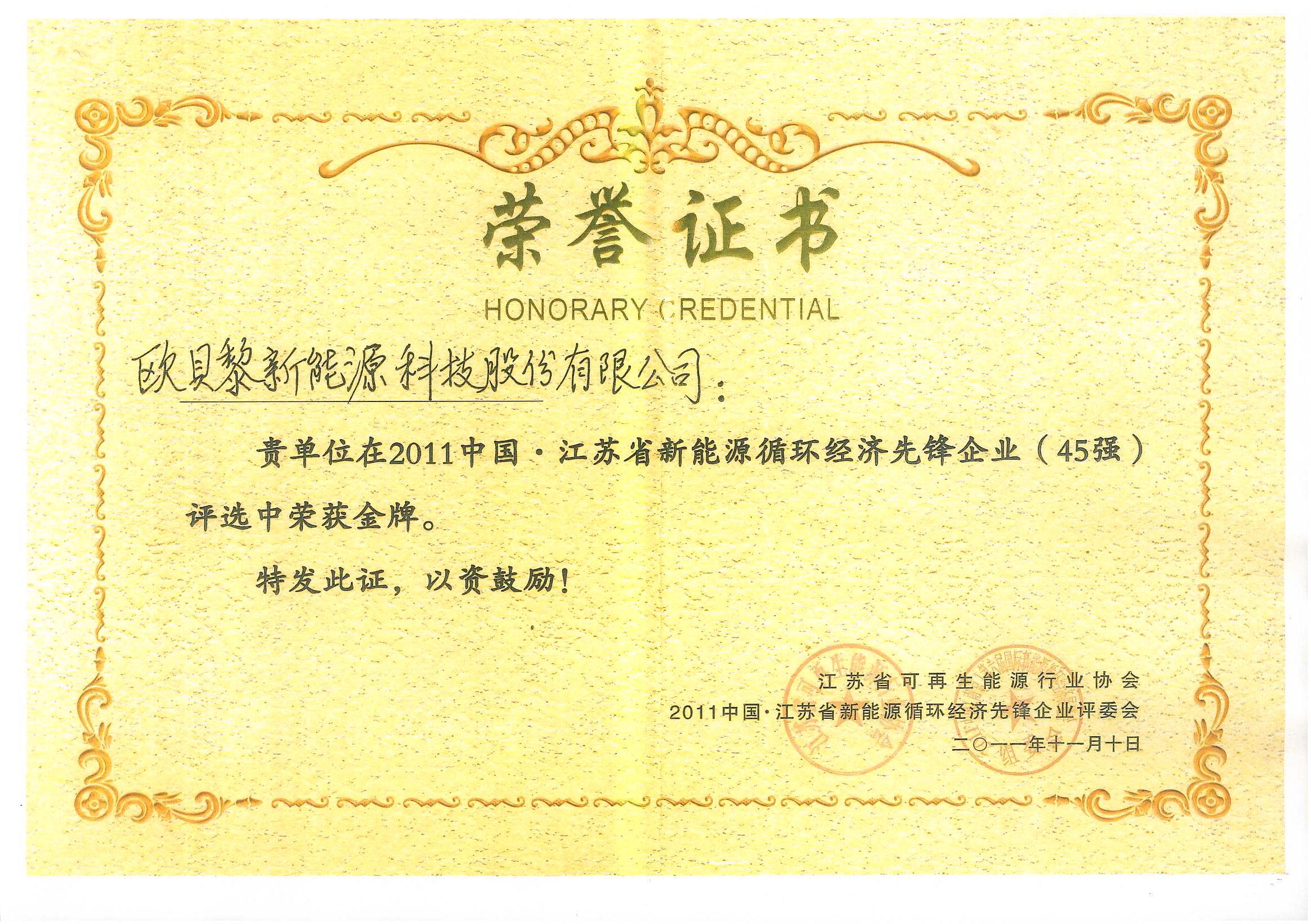江蘇省新能源循環經濟先鋒企業金牌
